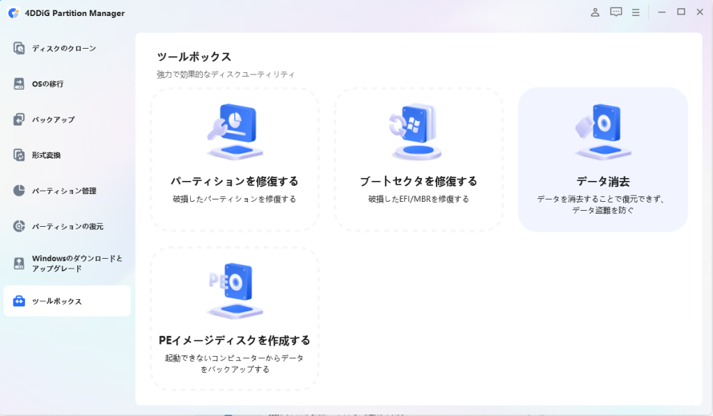4DDiG Partition Managerは、ディスククローンからデータ消去、バックアップまでをワンクリックで完結できる、非常に便利なオールインワンツールです。