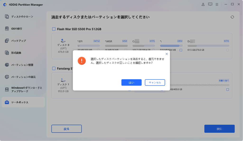 確認メッセージが表示されるので、削除するディスクまたはパーティションを間違いなく選択したことを確認したら、「はい」ボタンをクリックして続行してください。