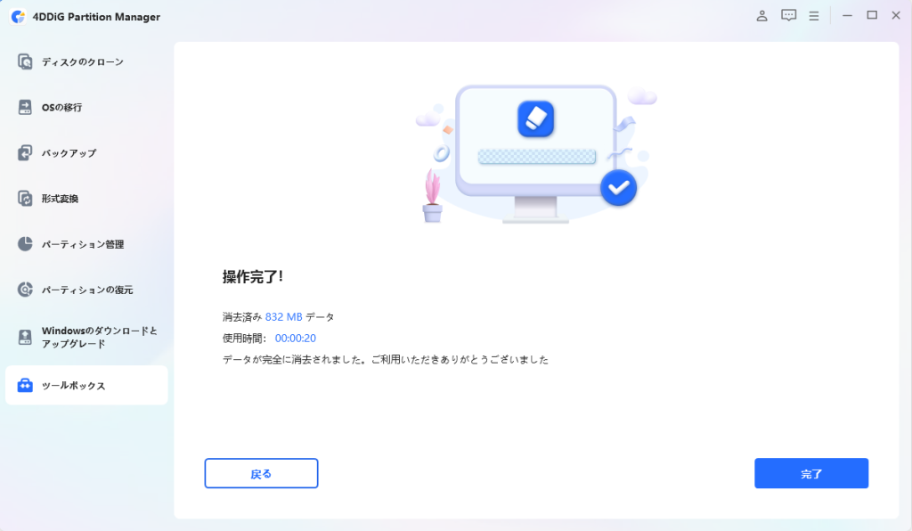 4DDiG Partition Managerの「データ消去」機能は、ディスク全体を上書き方式で完全消去します。複数回の上書き(DoD方式など)にも対応しており、復元不可能な状態にできます。